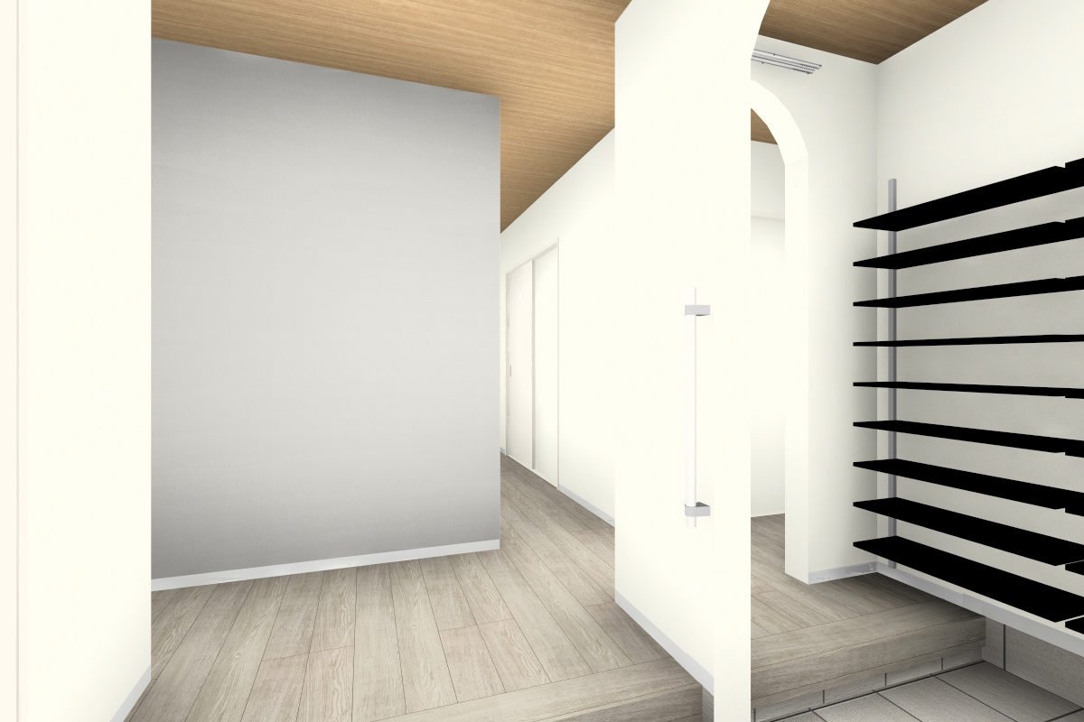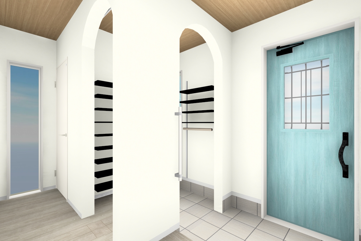 玄関を中心に右はエントランスクローゼット、左はパントリーへ。動線を分けることで、片付けも収納もスマートに。家族の帰宅動線が自然と整う心地よい設計です。