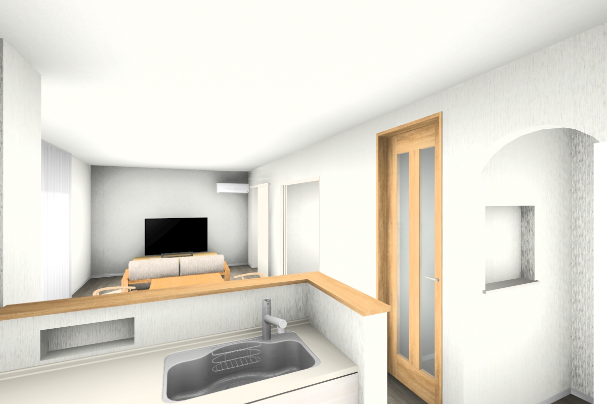 南欧風の外観に、やわらかな照明や棚などお施主様支給のアイテムが映える住まい。奥様こだわりの“かわいい”が随所に息づき、毎日が少し特別に感じられる空間です。