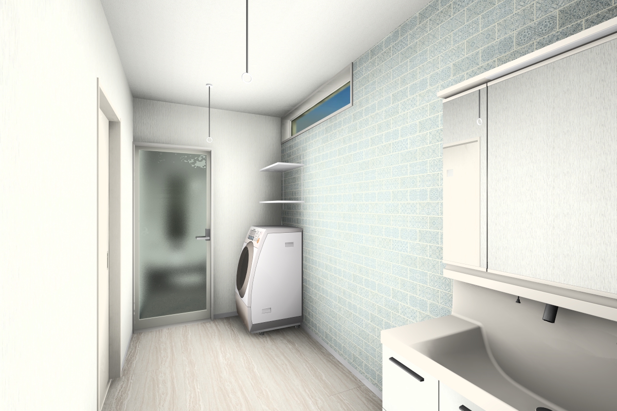 ロールカーテンで洗面と脱衣を仕切れる機能的な空間。“乾太くん”やホスクリーンの設置、収納棚も備え忙しい朝も快適に。家族みんなが使いやすい工夫が詰まっています。