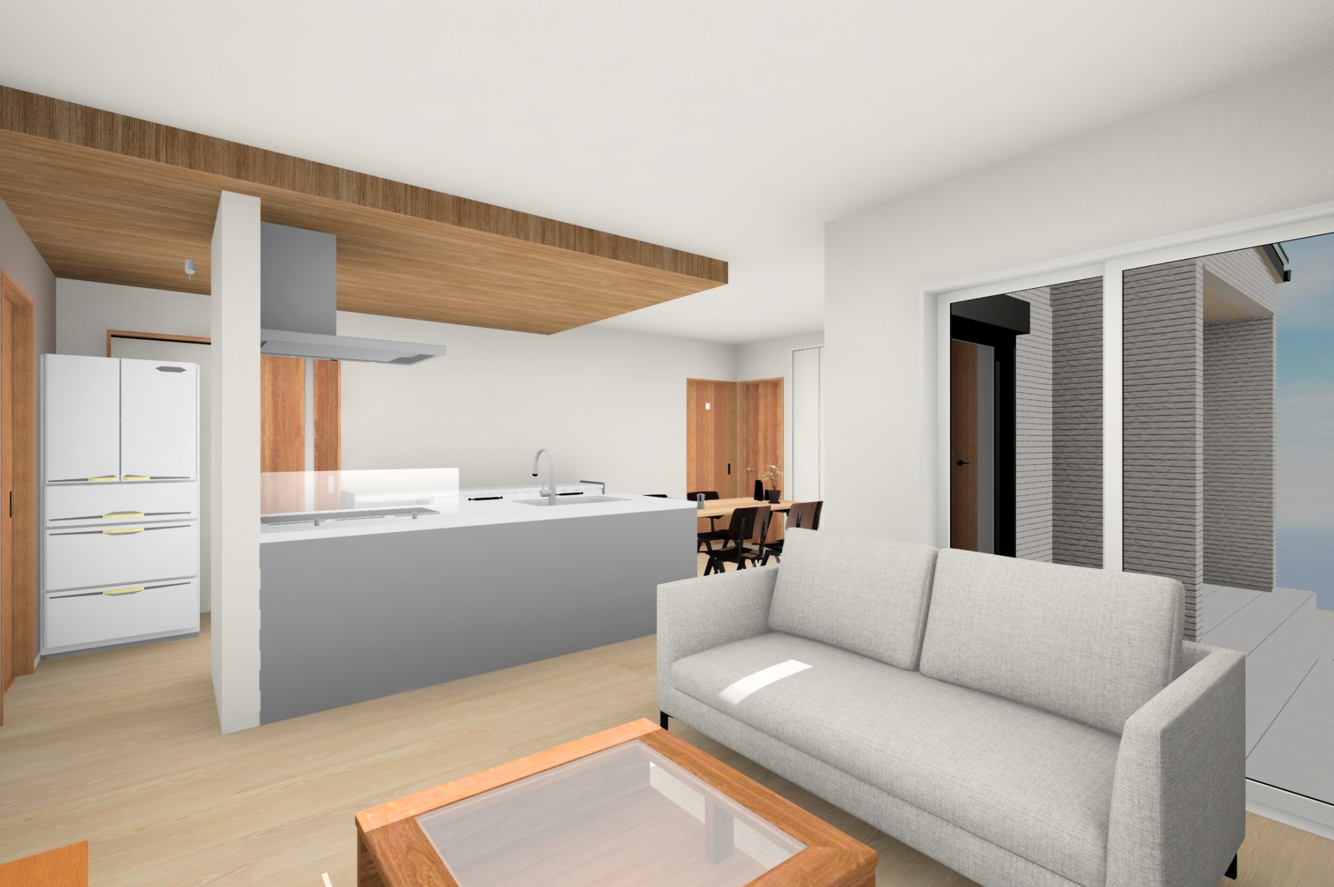 LDKをL型にレイアウトし、2方向の掃き出し窓からタイルデッキへ。光と風が抜ける心地よいリビング空間が生まれました。室内外がゆるやかにつながる設計で、家族の時間が自然と広がります。