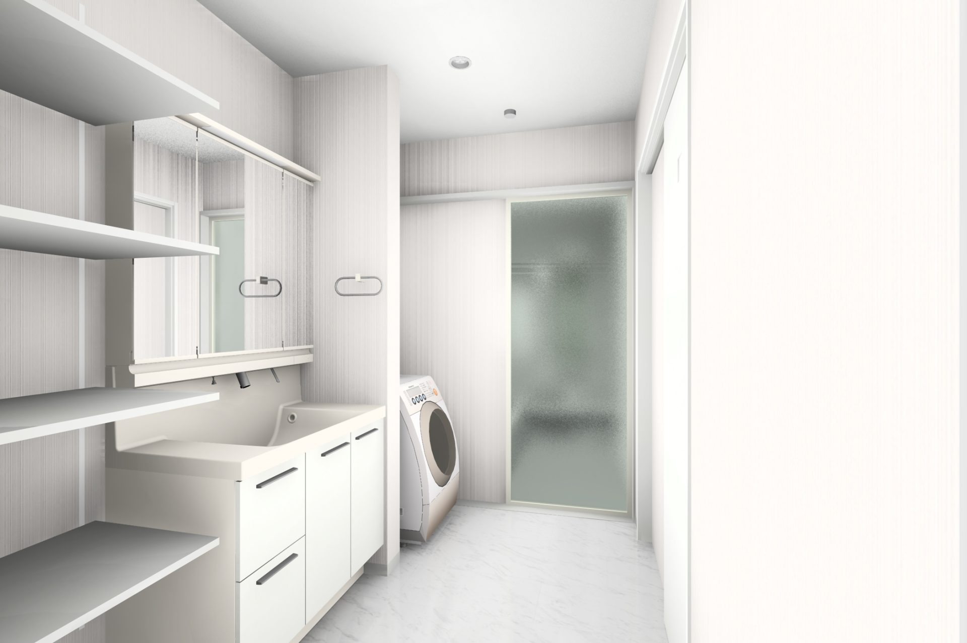 洗面室・物干しスペース・ファミリークローゼットが近く、洗濯の一連の流れがスムーズに完結。毎日の家事が驚くほど軽やかになり、暮らしにゆとりを生み出します。