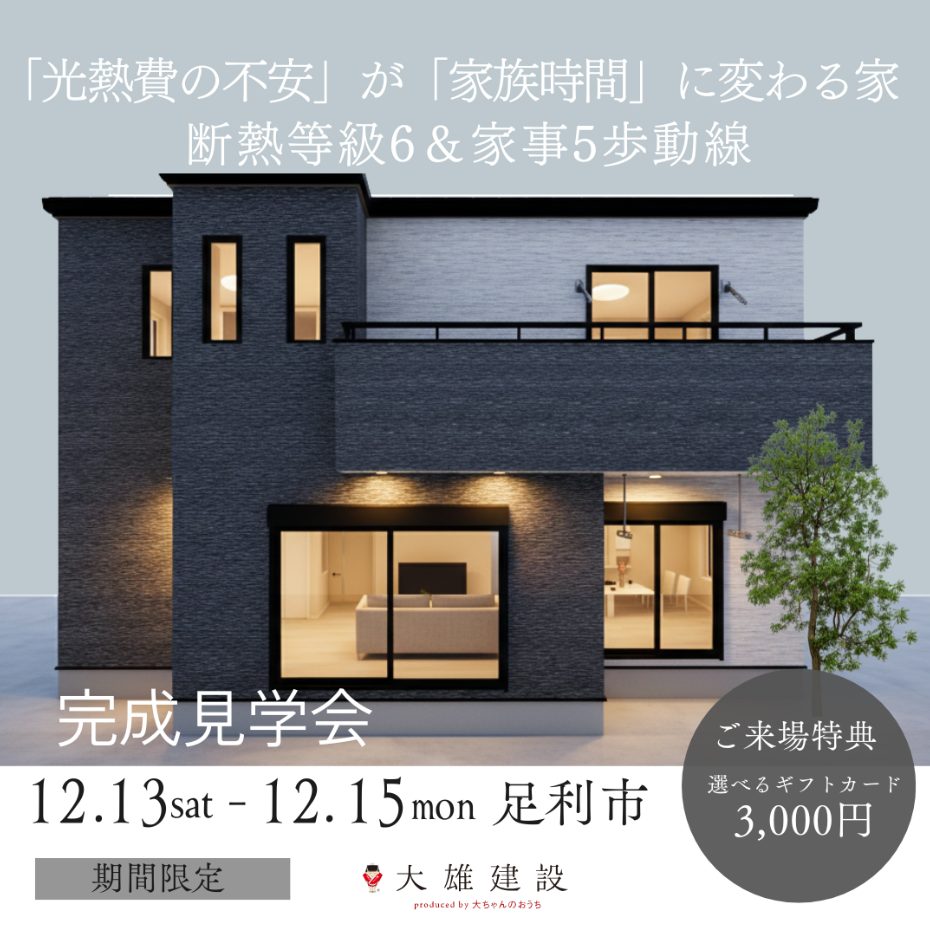 【足利市・平日予約可】12月13日(土)・14日(日)・15日(月)足利市朝倉町お施主様邸完成見学会